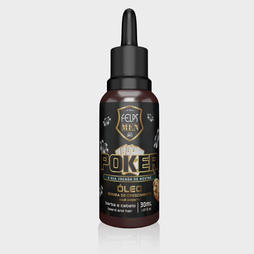 Felps Men Poker Óleo reparador para barba e cabelo, foi formulado com uma bomba de vitaminas que estimula o crescimento. Fios extremamente fortes, macios e com brilho, da raiz às pontas.